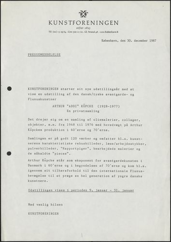 Back Kunstforeningen Pressemeddelelse, 1987: Arthur "Addi" Köpcke. En privatsamling Facts Document type Exhibition records Mentioned people Arthur Köpcke Mentioned exhibitions 1988-1-9 - 1988-1-31, Arthur "Addi" Köpcke. En privatsamling Original