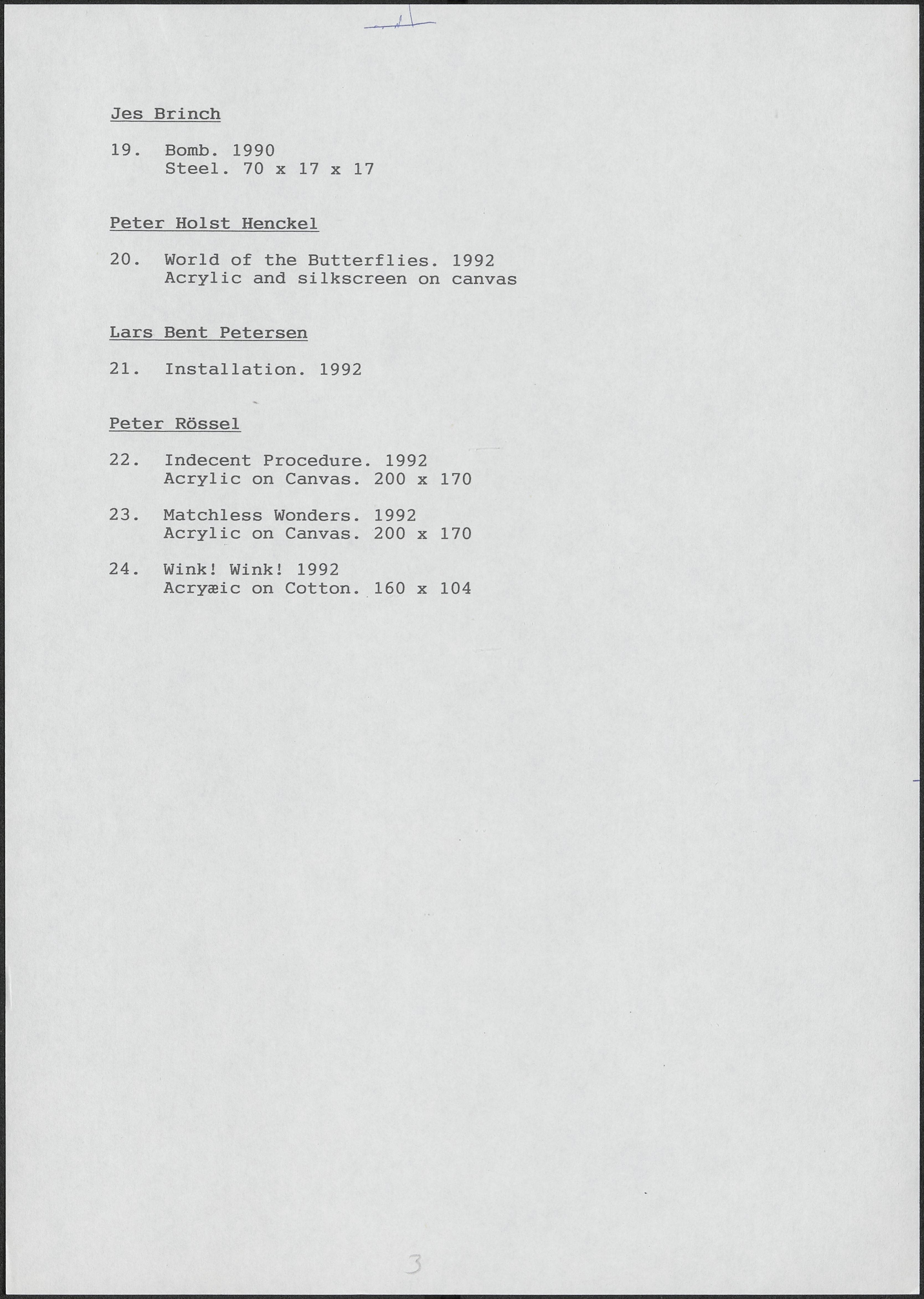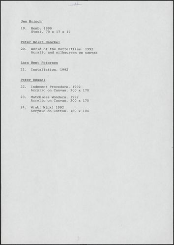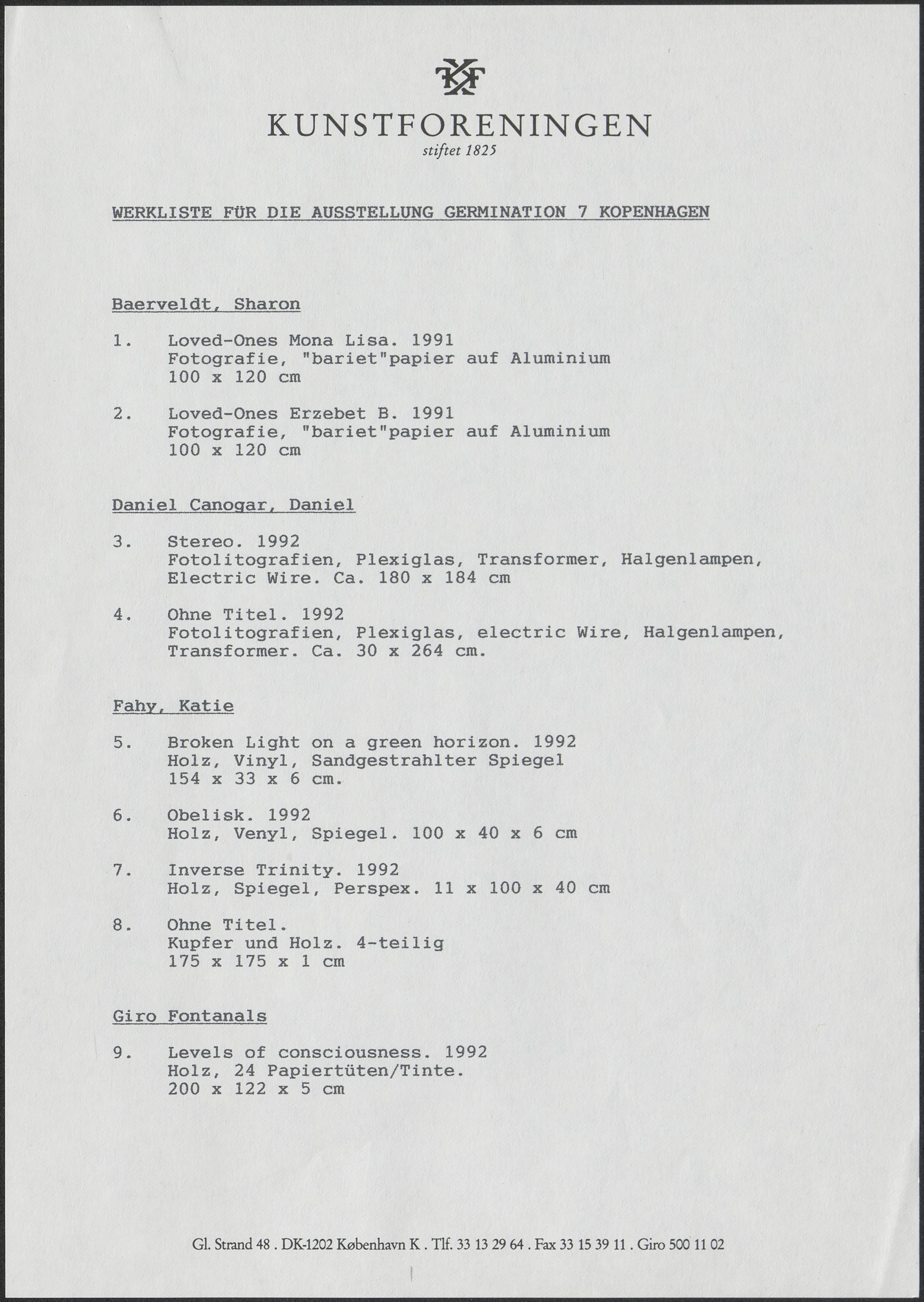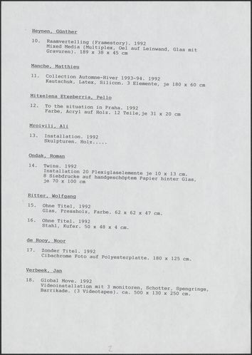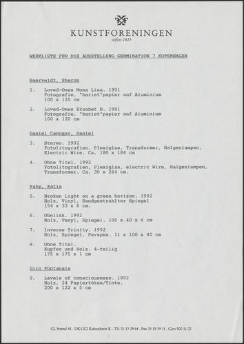 Back Kunstforeningen Værkliste, 1993: Germinations 7 Facts Document type Exhibition records Mentioned people Erzsébet BaerveldtJes BrinchDaniel CanogarNoor de RooyKatie FahyToni Giró FontanalsGünter HeynenPeter Holst HenckelMatthieu ManchePello Mitxelena EtxeberriaAli MrovioviliRoman Ondak Lars Bent PetersenWolfgang RitterPeter RössellJan Verbeek Mentioned exhibitions 1993-4-30 - 1993-5-30, Germinations 7 - europæisk biennale for unge kunstnere Original