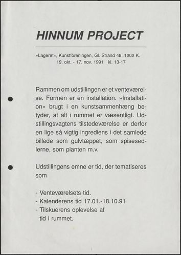 Back Kunstforeningen Formidlingsmateriale, 1991: Hinnum Project Facts Document type Exhibition records Mentioned people Susan Hinnum Mentioned exhibitions 1991-10-19 - 1991-11-17, Hinnum Project Original