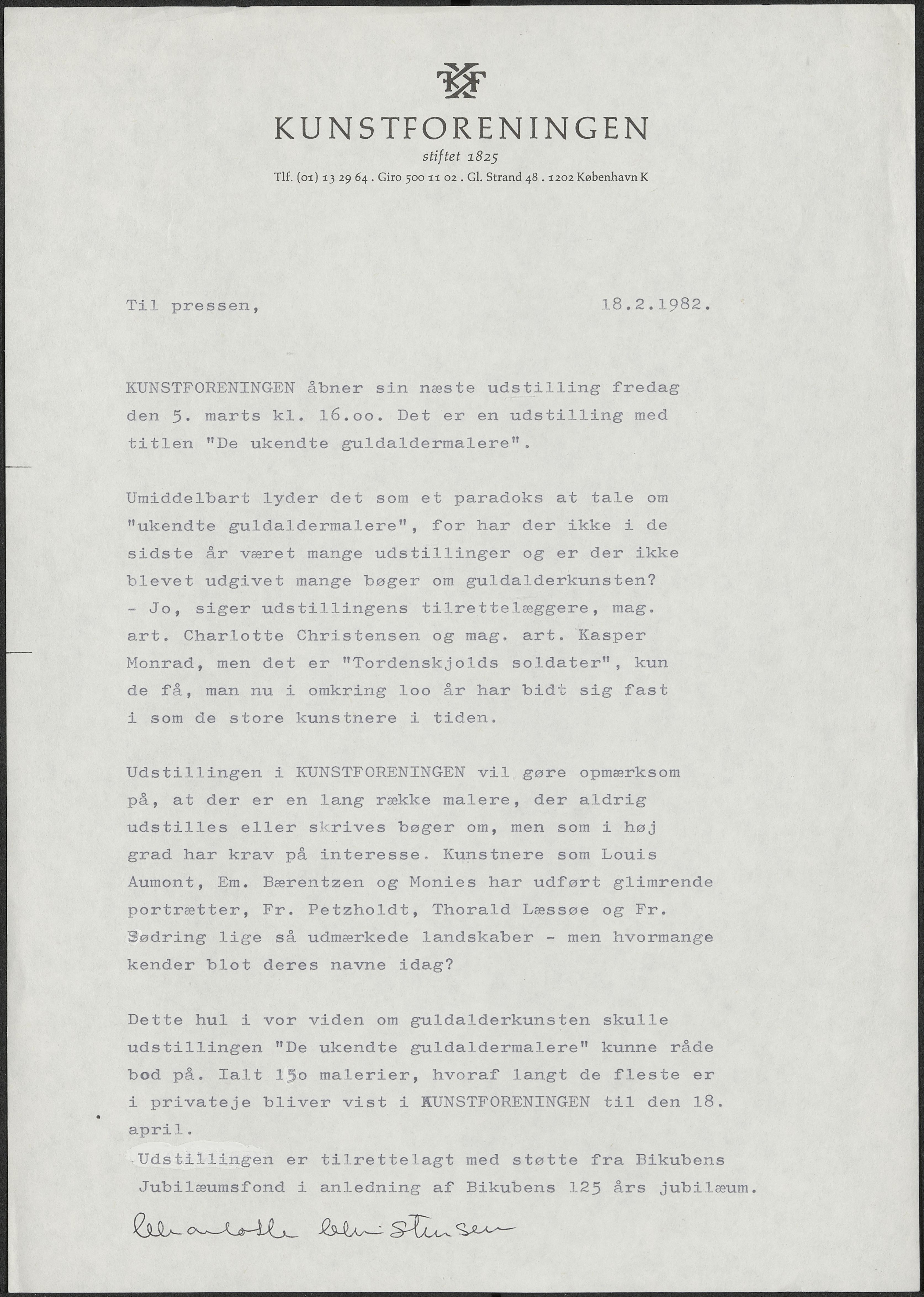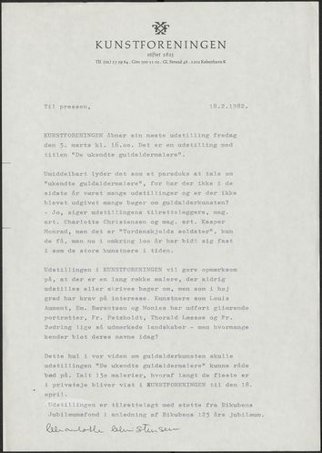 Back Kunstforeningen Pressemeddelelse, 1982: De ukendte guldaldermalere Facts Document type Exhibition records Mentioned people Charlotte ChristensenKasper Monrad Mentioned exhibitions 1982-3-6 - 1982-4-18, De ukendte guldaldermalere Original