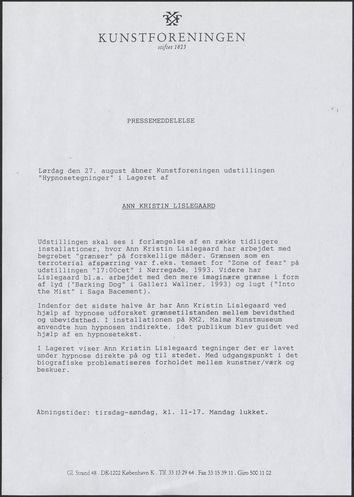 Back Kunstforeningen Pressemeddelelse, 1994: Ann Kristin Lislegaard. Hypnosetegninger Facts Document type Exhibition records Mentioned people Ann Lislegaard Mentioned exhibitions 1994-8-27 - 1994-9-25, Ann Kristin Lislegaard. Hypnosetegninger Original