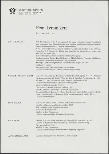 Back Kunstforeningen Formidlingsmateriale, 1971: Fem keramikere Facts Document type Exhibition records Mentioned people Julie HømAnne KjærsgaardNils KählerGudrun Meedom BæchLene Regius Mentioned raffles 1971-1-23, Bortlodningen 1971 af kunstindkøbet for 1970 samt udstillingen "Fem keramikere" Original