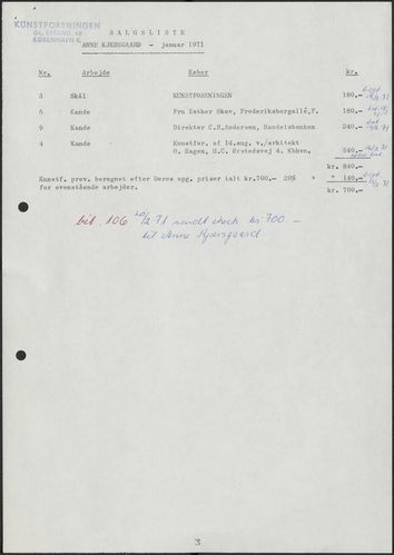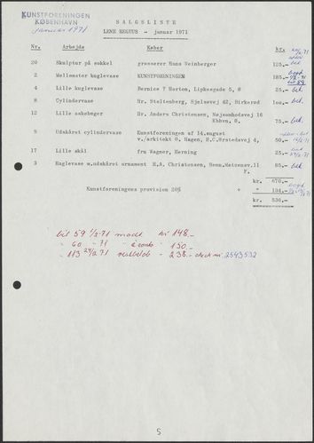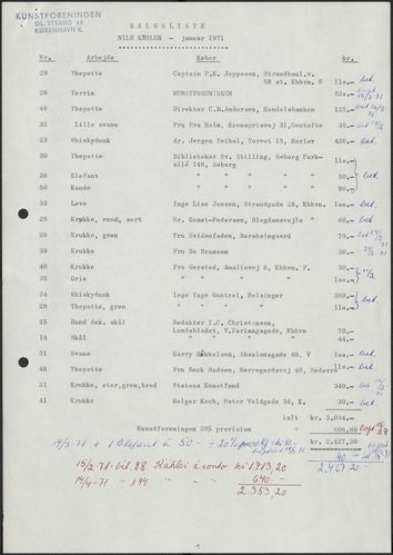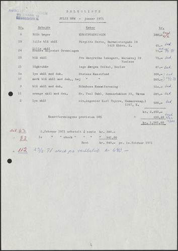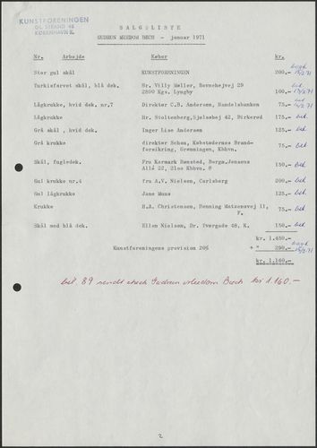 Back Kunstforeningen Salgsliste, 1971: Fem keramikere Facts Document type Exhibition records Mentioned people Julie HømAnne KjærsgaardNils KählerGudrun Meedom BæchLene Regius Mentioned raffles 1971-1-23, Bortlodningen 1971 af kunstindkøbet for 1970 samt udstillingen "Fem keramikere" Original