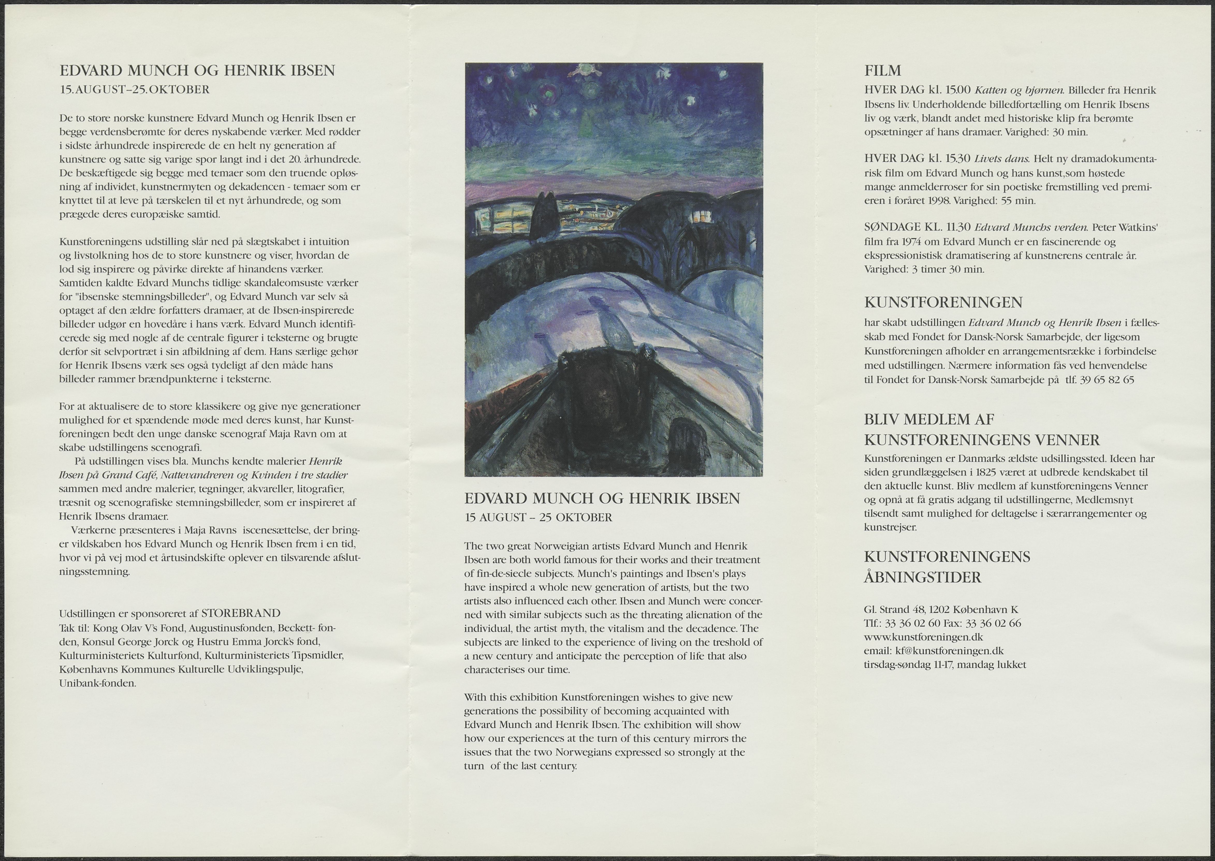 Back Kunstforeningen 1998 Facts Document type Brochure Mentioned people Henrik IbsenEdvard Munch Mentioned exhibitions 1998-8-15 - 1998-10-25, Edvard Munch og Henrik Ibsen Original
