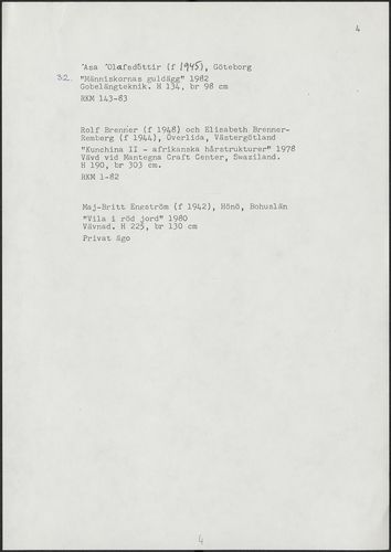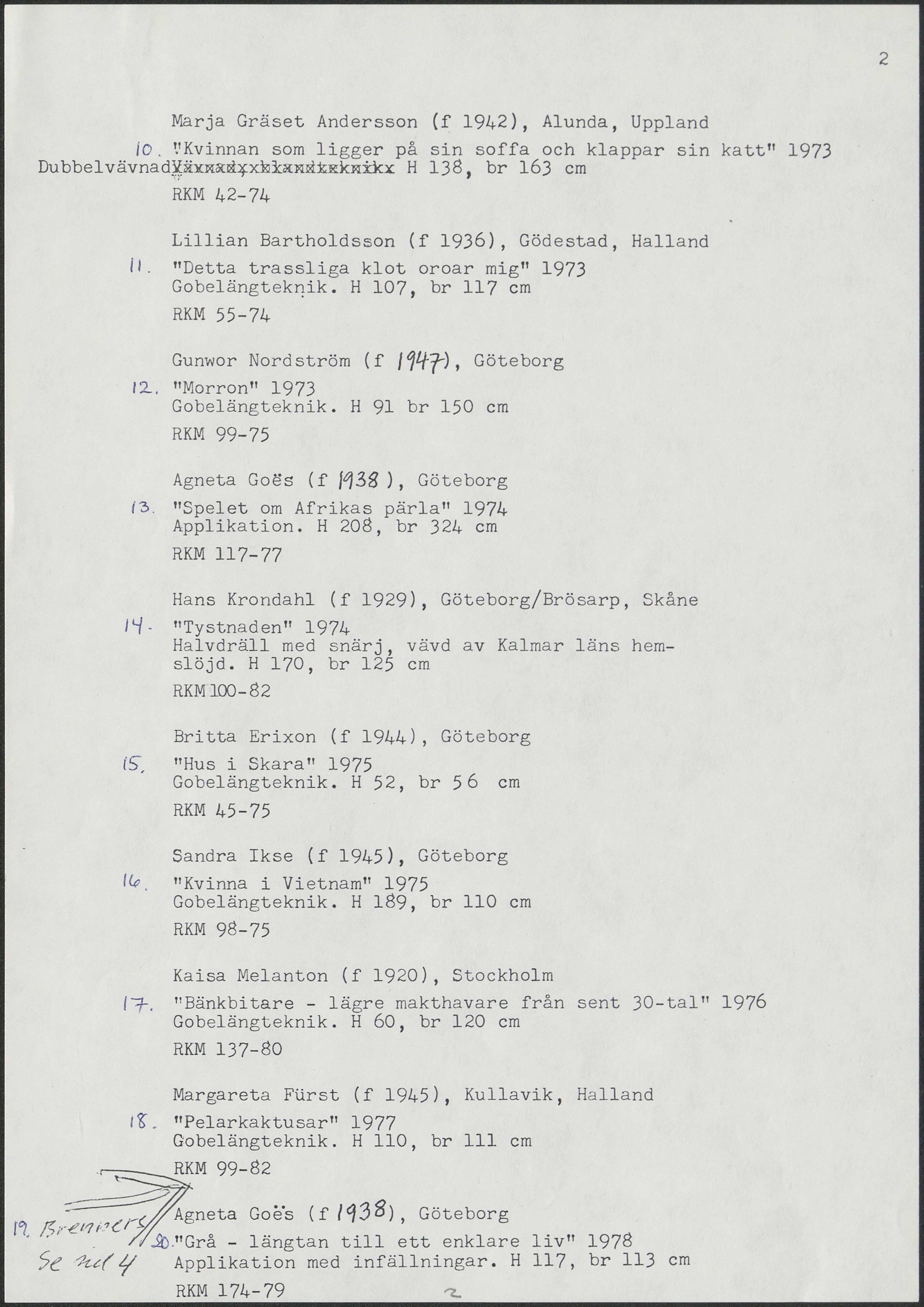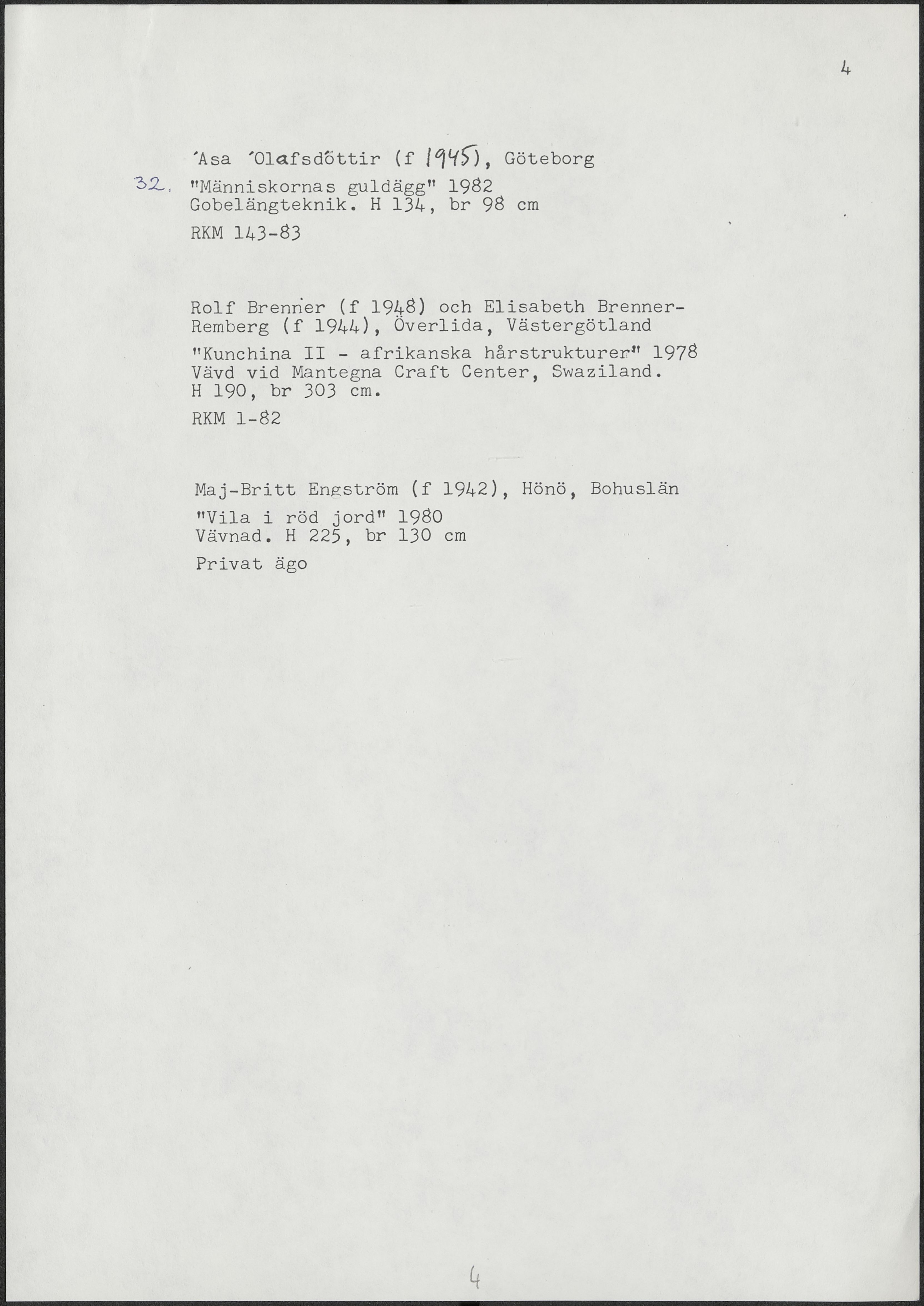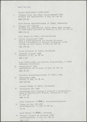 Værkliste, 1984: Nutidig svensk billedtekstil fra Röhsska Konstslöjdmuseets samlinger