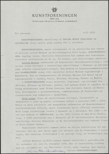 Back Kunstforeningen Pressemeddelelse, 1979: Erik Lynge. Alfred Madsen Facts Document type Exhibition records Mentioned people Erik LyngeAlfred Madsen Mentioned exhibitions 1979-11-13 - 1979-12-16, Erik Lynge. Alfred Madsen Original