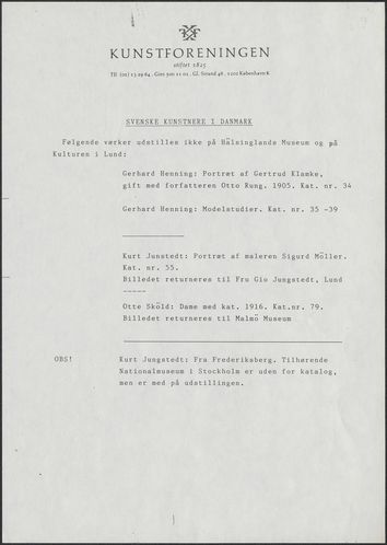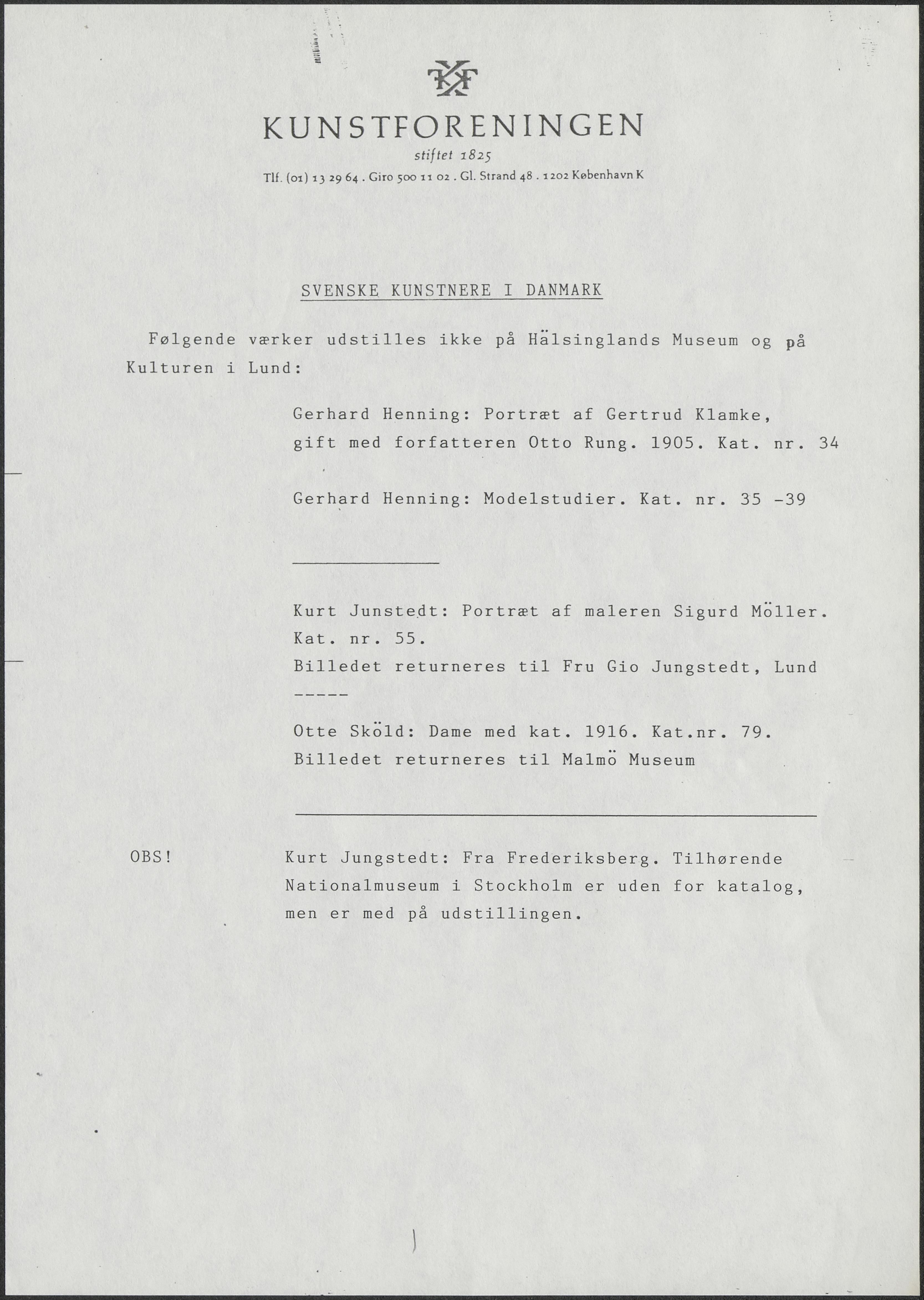 Back Kunstforeningen Diverse noter, 1986: Svenske kunstnere i Danmark Facts Document type Exhibition records Mentioned people Gerhard HenningKurt JungstedtOtto Sköld Mentioned exhibitions 1986-10-10 - 1986-11-9, Svenske kunstnere i Danmark Original