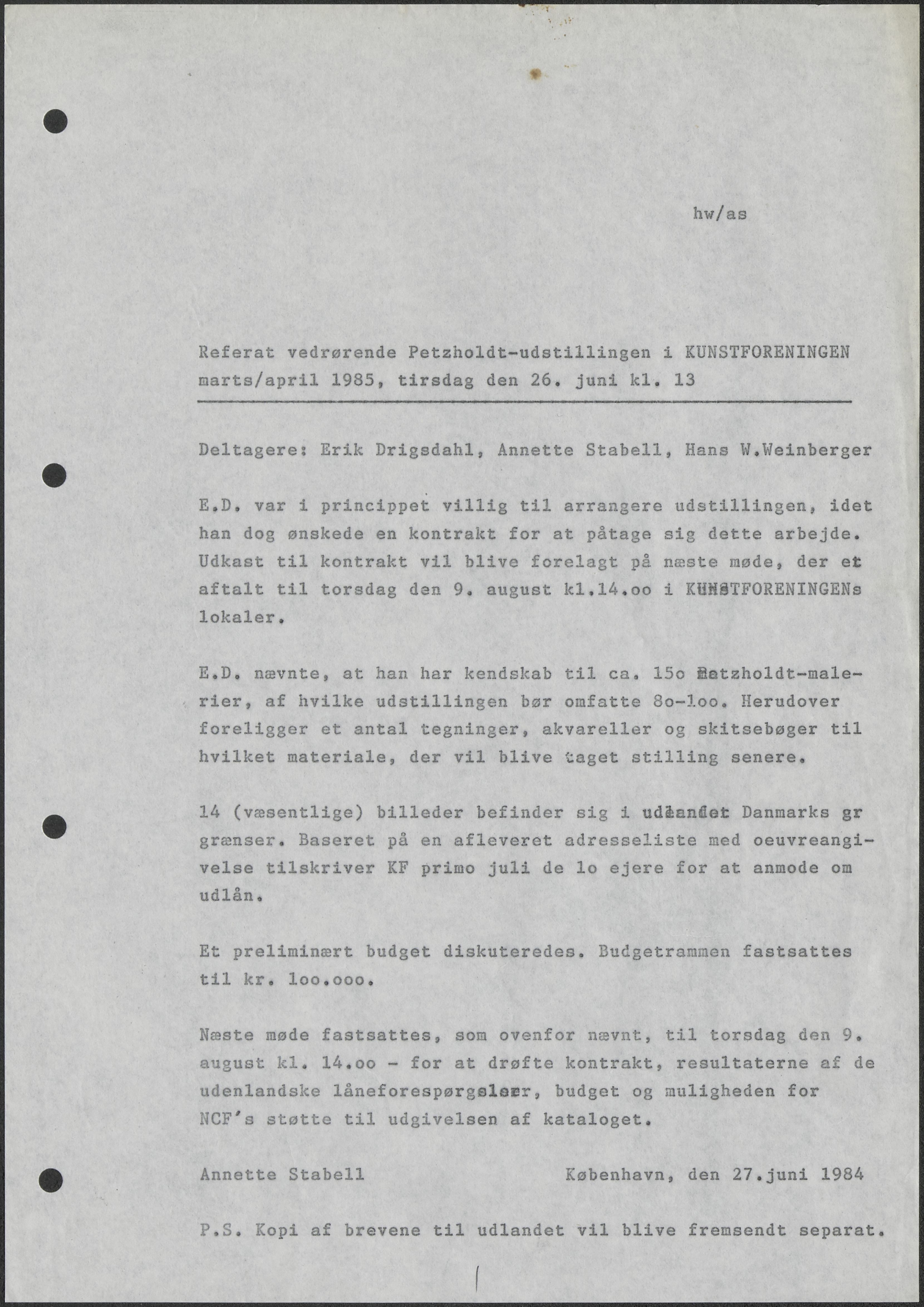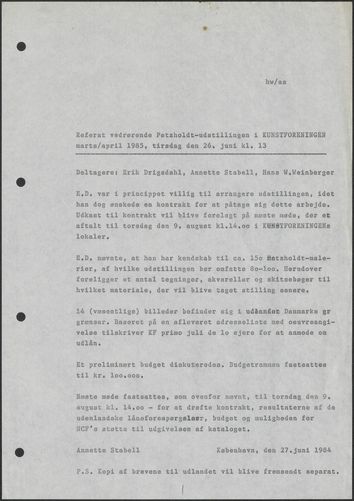 Back Kunstforeningen Mødereferat, 1985: Fritz Petzholdt Facts Document type Exhibition records Mentioned people Erik DrigsdahlAnnette StabellHans Weinberger Mentioned exhibitions 1985-3-23 - 1985-4-21, Fritz Petzholdt Original