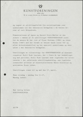 Back Kunstforeningen Pressemeddelelse, 1988: Agnes og Harald Slott-Møller. Mellem kunst og idealer Facts Document type Exhibition records Mentioned people Agnes Slott-MøllerHarald Slott-Møller Mentioned exhibitions 1988-3-16 - 1988-4-17, Agnes og Harald Slott-Møller. Mellem kunst og idealer Original