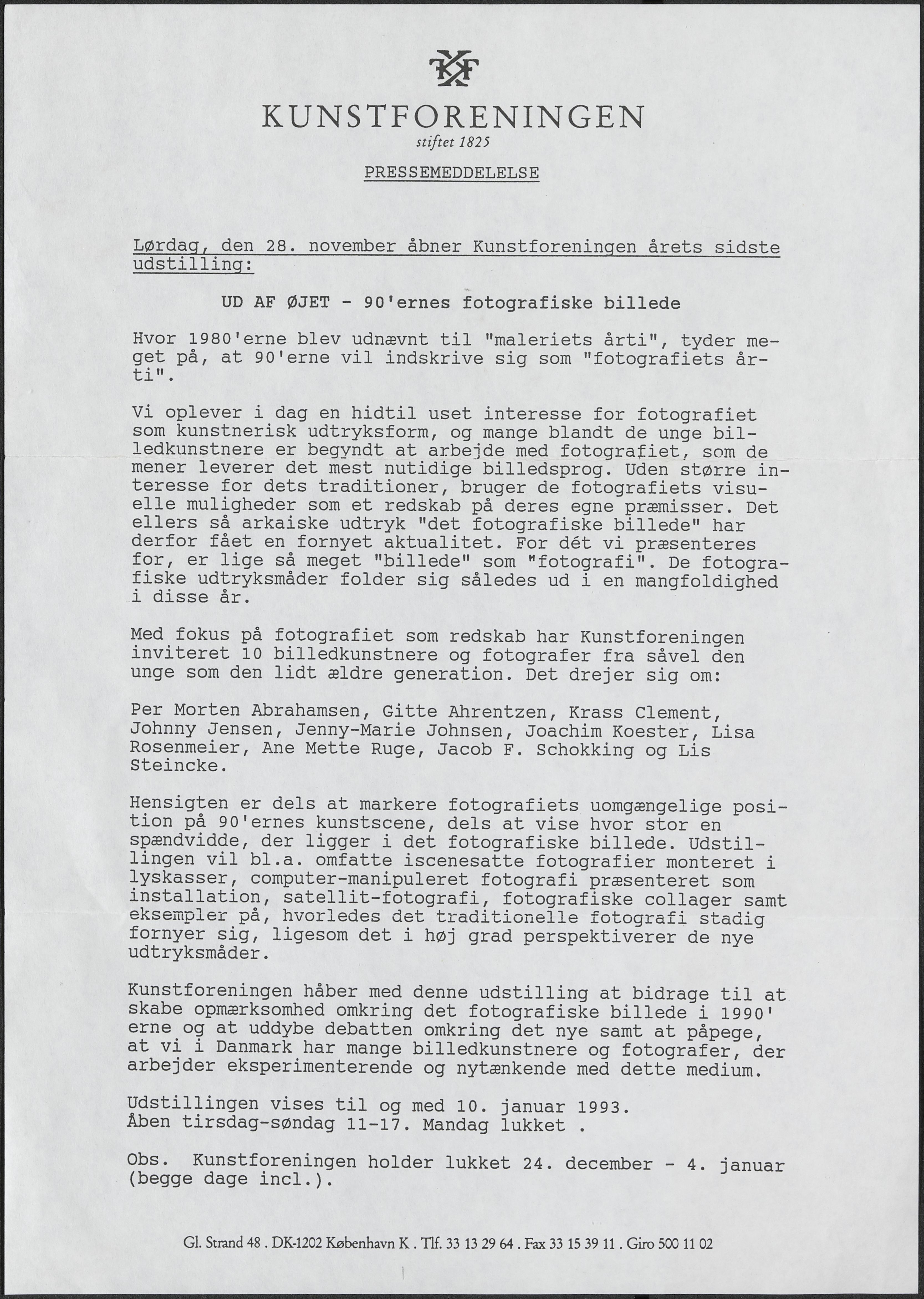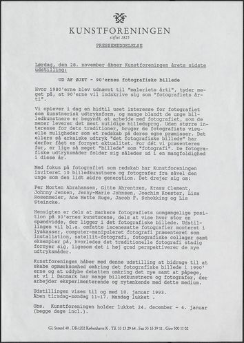 Back Kunstforeningen Pressemeddelelse, 1992: Ud af øjet Facts Document type Exhibition records Mentioned people Per Morten AbrahamsenGitte AhrentzenKrass ClementJohnny JensenJenny-Marie JohnsenJoachim KoesterLisa RosenmeierAne Mette RugeJacob SchokkingLis Steincke Mentioned exhibitions 1992-11-28 - 1993-1-10, Ud af øjet Original