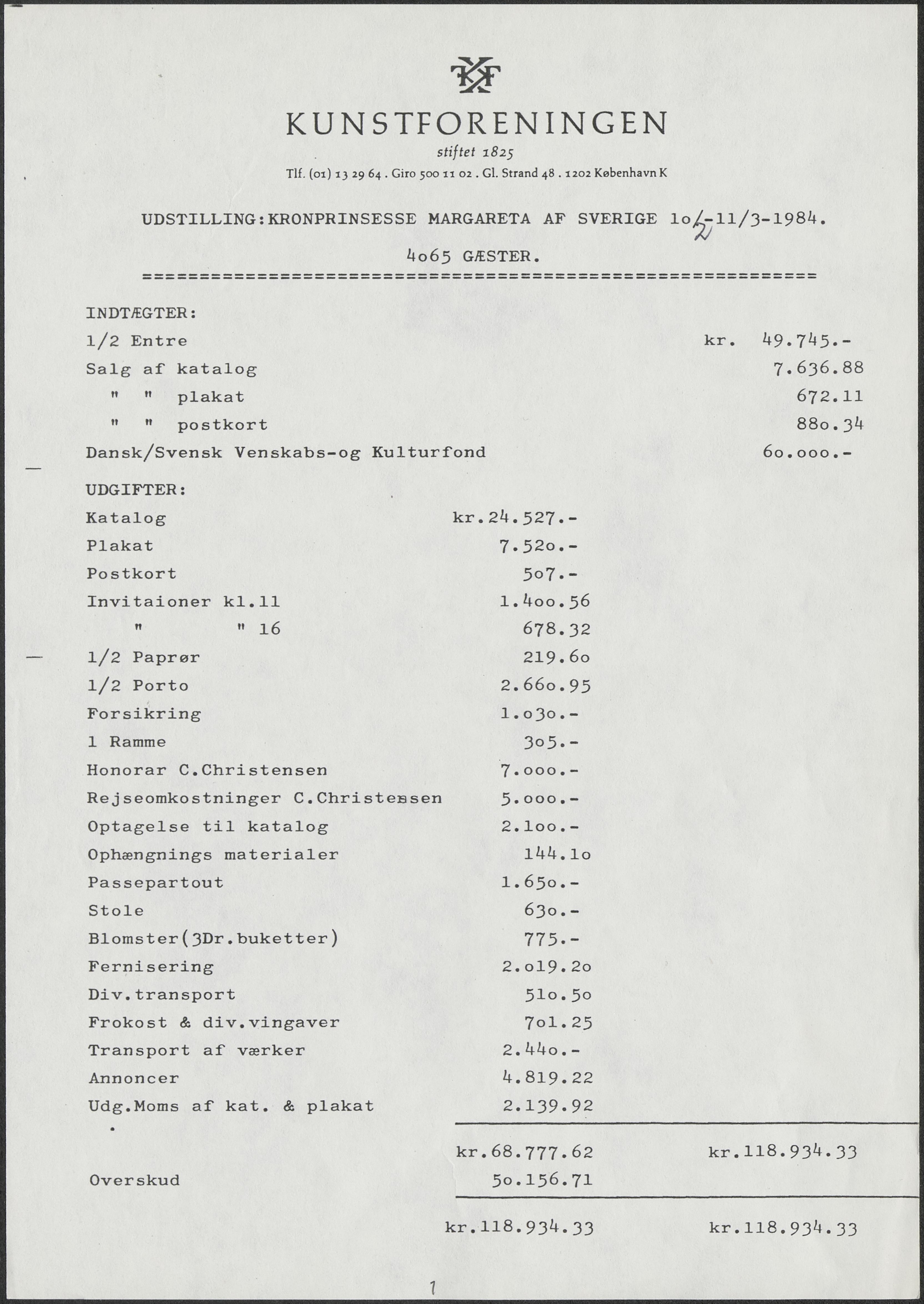 Back Kunstforeningen Udstillingsregnskab, 1984: Kronprinsesse Margareta af Sverige Facts Document type Exhibition records Mentioned people Margareta af Sverige Mentioned exhibitions 1984-2-11 - 1984-3-11, Kronprinsesse Margareta af Sverige Original