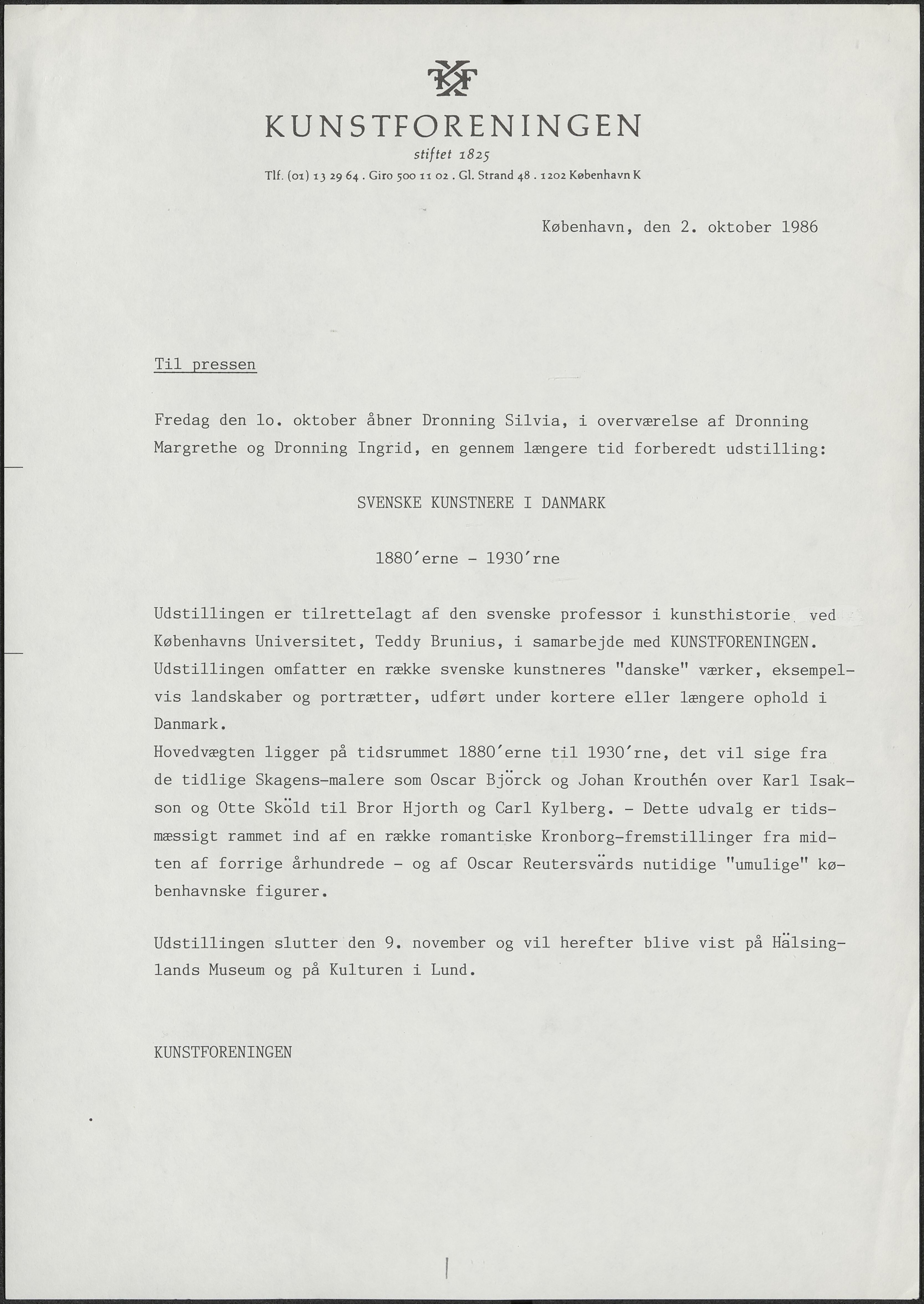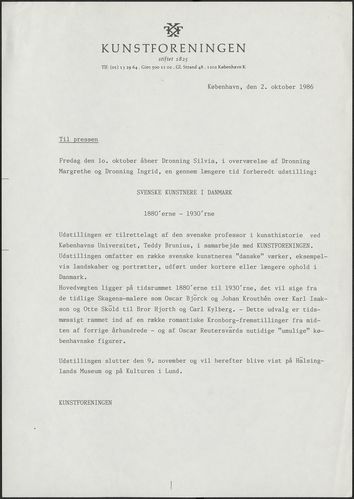 Back Kunstforeningen Pressemeddelelse, 1986: Svenske kunstnere i Danmark Facts Document type Exhibition records Mentioned people Oscar BjörckTeddy BruniusBror HjorthKarl IsaksonJohan KrouthénCarl KylbergOscar ReutersvärdOtto Sköld Mentioned exhibitions 1986-10-10 - 1986-11-9, Svenske kunstnere i Danmark Original