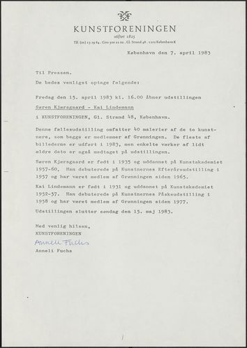 Back Kunstforeningen Pressemeddelelse, 1983: Søren Kjærsgaard - Kai Lindemann Facts Document type Exhibition records Mentioned people Søren KjærsgaardKai Lindemann Mentioned exhibitions 1983-4-15 - 1983-5-15, Søren Kjærsgaard - Kai Lindemann Original
