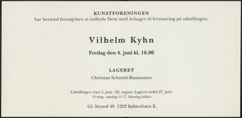 Back Kunstforeningen 1993-06-04 Document content Awaiting summary Facts Document type Invitation card Sender's location København Mentioned people Vilhelm KyhnChristian Schmidt-Rasmussen Mentioned exhibitions 1993-6-5 - 1993-8-22, Vilhelm Kyhn 1993-6-5 - 1993-6-27, Christian Schmidt-Rasmussen. Refree Love IV Original