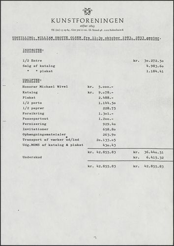 Back Kunstforeningen Udstillingsregnskab, 1983: William Skotte Olsen Facts Document type Exhibition records Mentioned people William Skotte Olsen Mentioned exhibitions 1983-10-11 - 1983-10-30, William Skotte Olsen Original