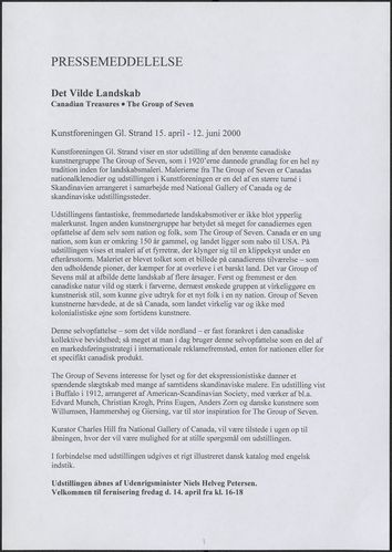 Tilbage Kunstforeningen Pressemeddelelse, 2000: Det vilde landskab. Canadian Treasures - The Group of Seven Fakta Dokumenttype Udstillingsprotokol Omtalte udstillinger 2000-4-15 - 2000-6-23, Det vilde landskab. Canadian Treasures - The Group of Seven Original